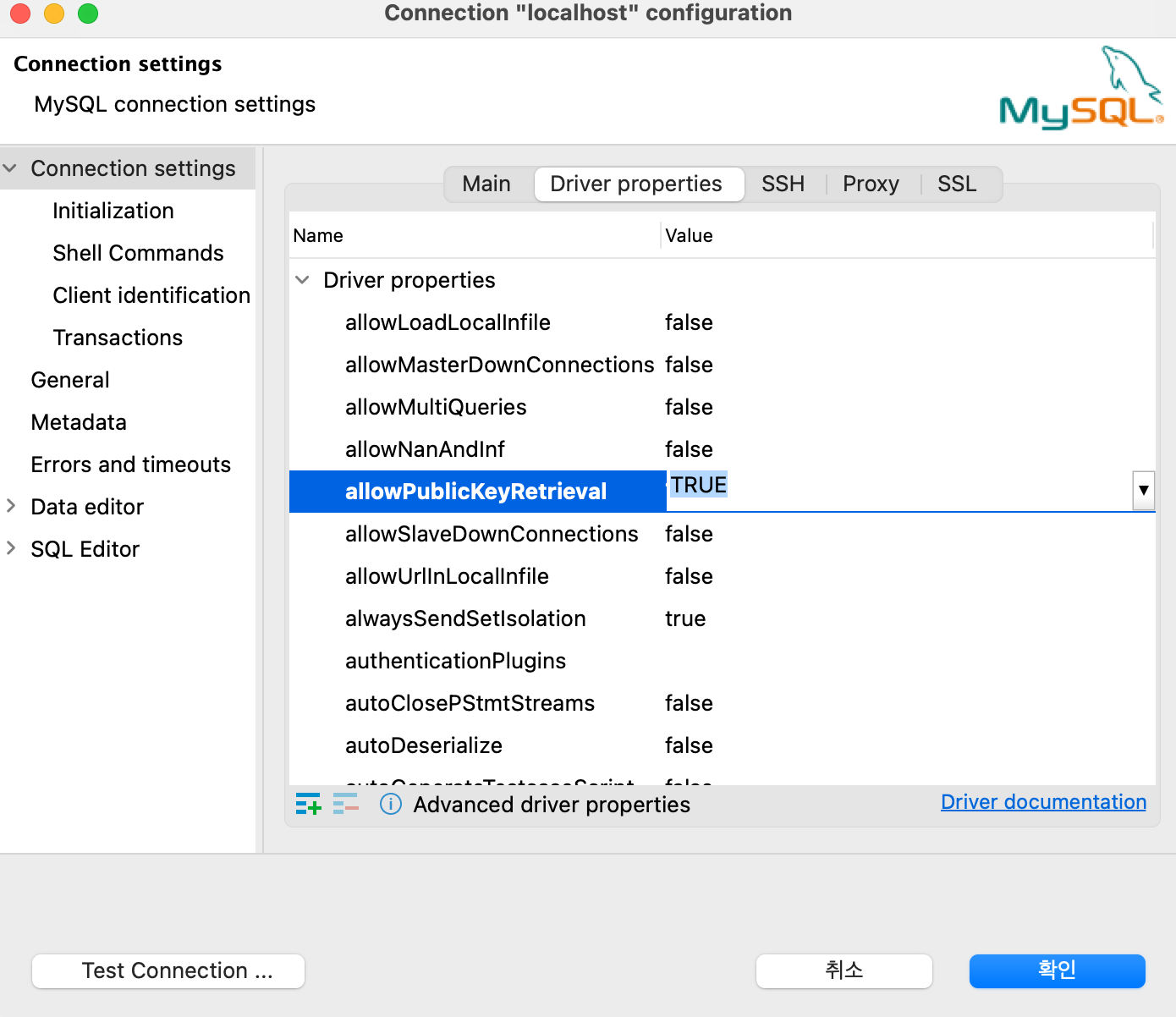 3. allowPublicKeyRetireval값을 true로 수정후 접속